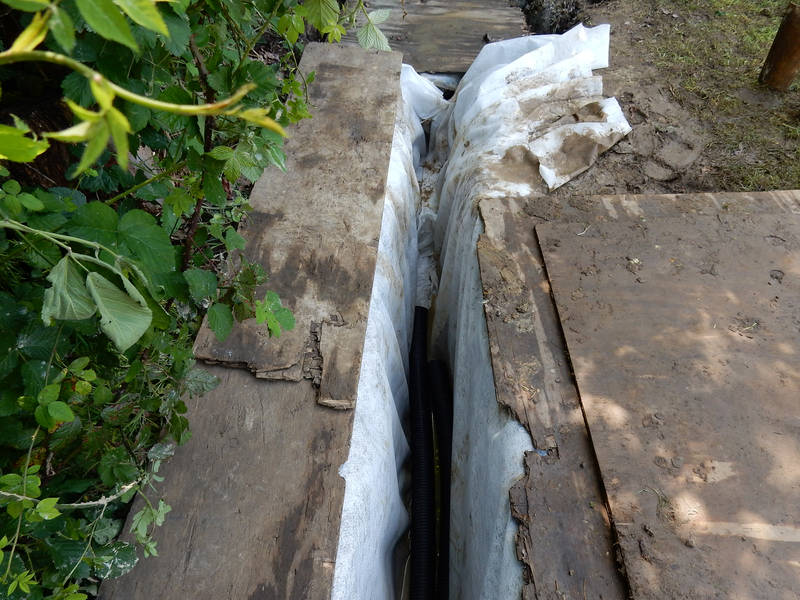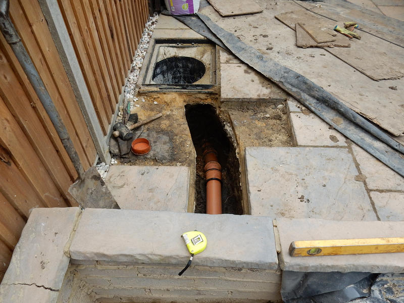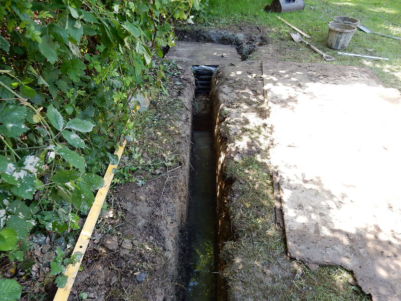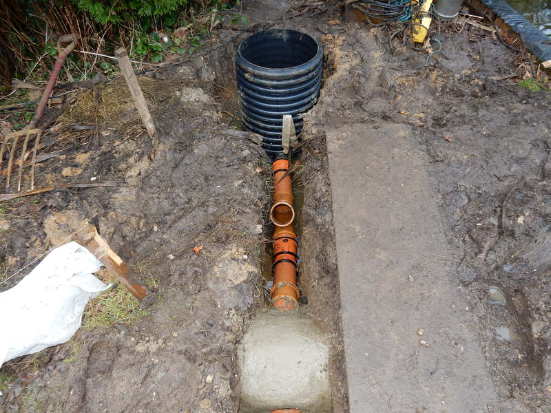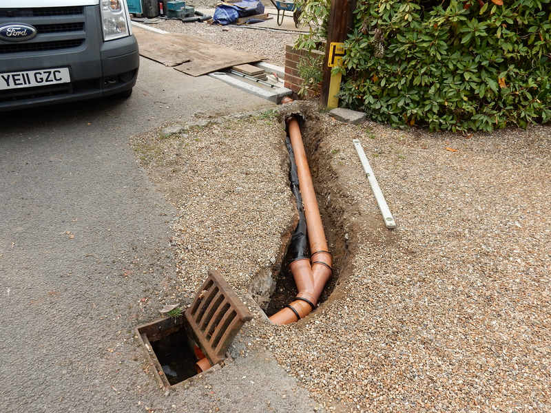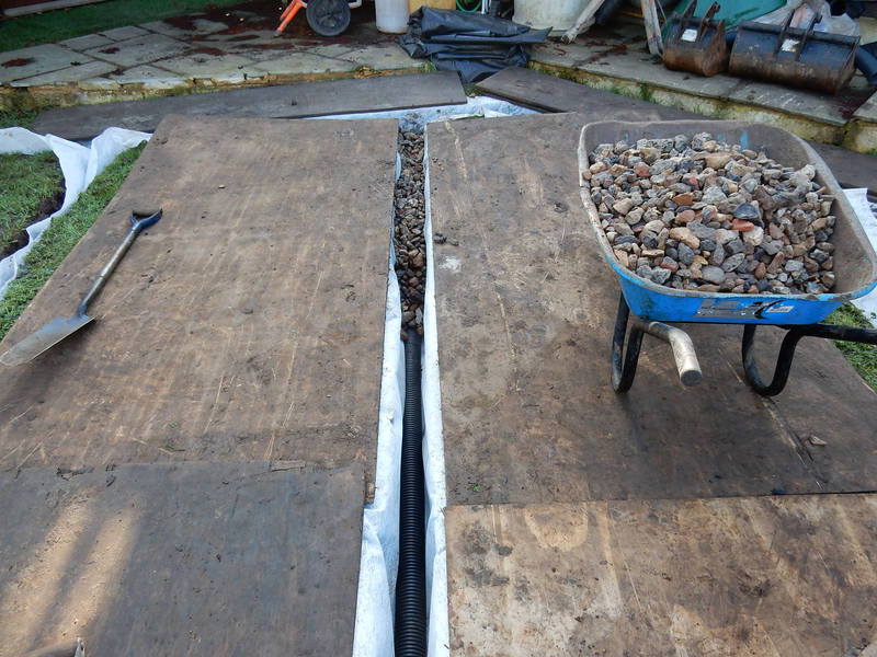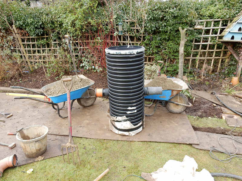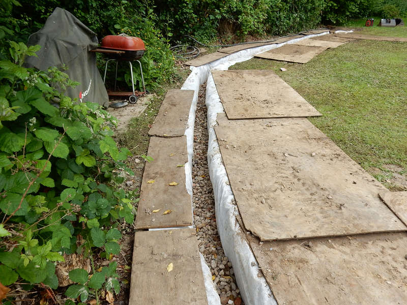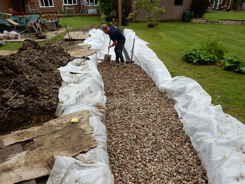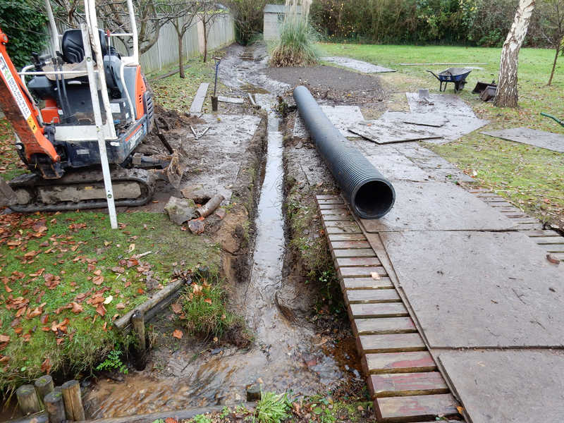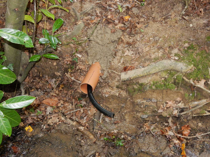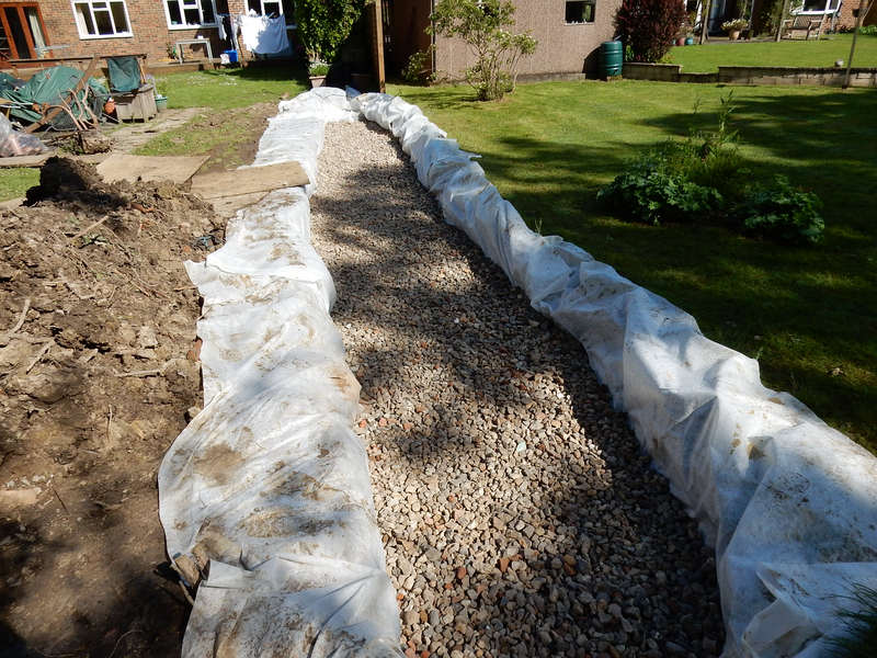 Large 160mm diameter pipe was used to assist and accomodate more efficent dispersal of water leading to a large diamater land drain within a protective drainage run in front of the house. Final dispersal of collected water was the lowest part of the garden and adjacent scrub land.