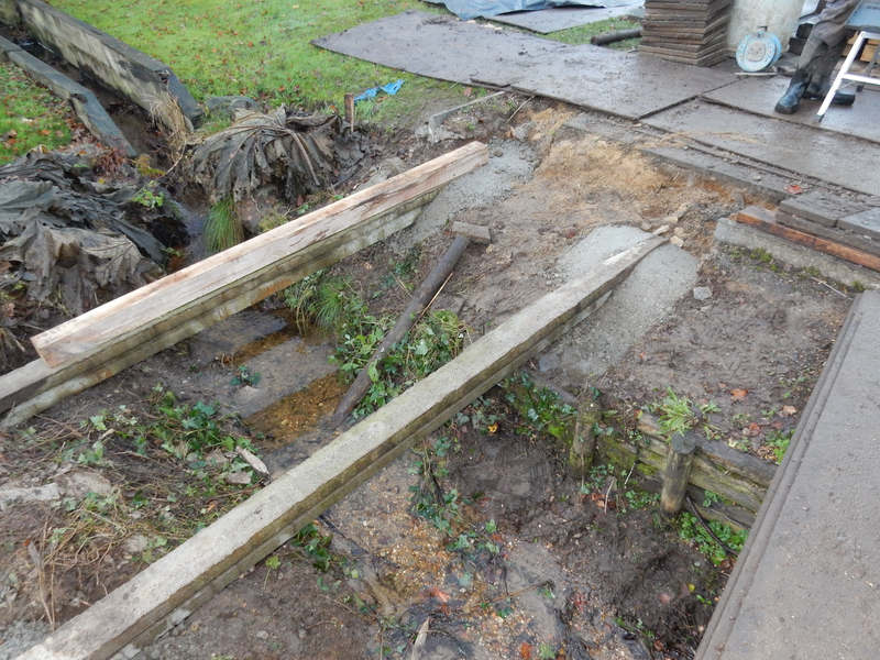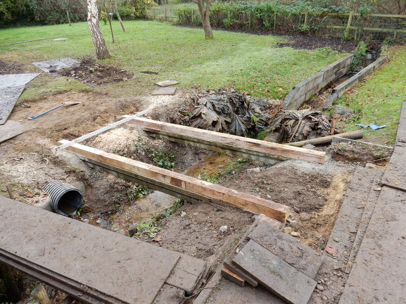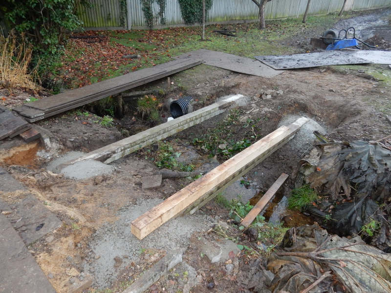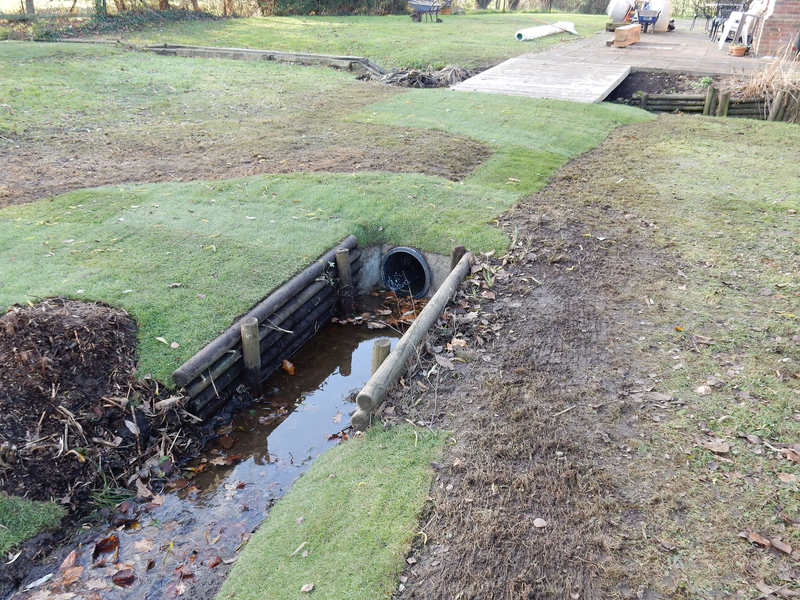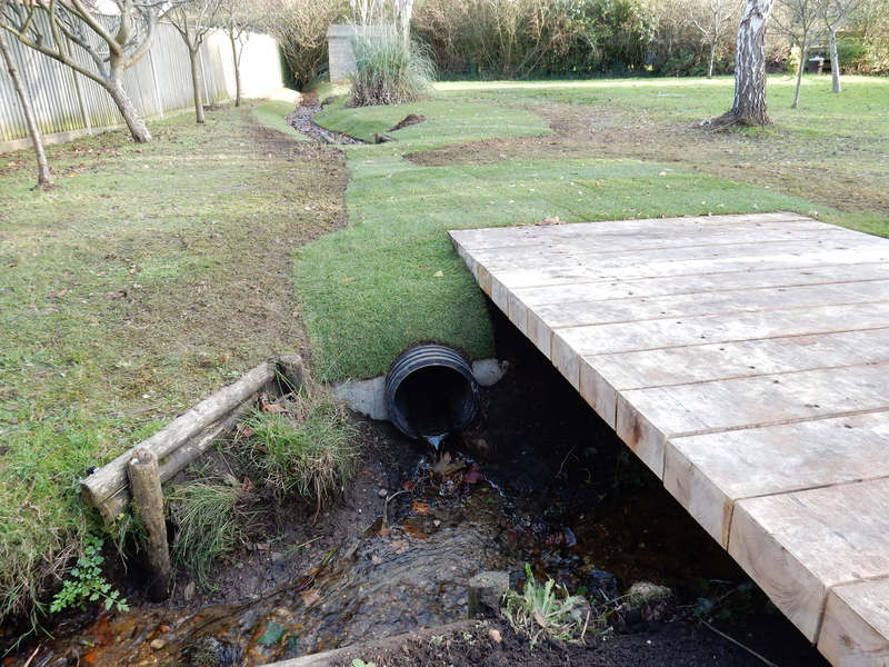 The old under ground pipe was to small in diameter so a new larger diameter twinwall pipe was installed with both ends made good back to the pipe. Another requirement here for the new house owner was replacement of an old dilapidated timber bridge. A new one was installed using new oak sleepers.