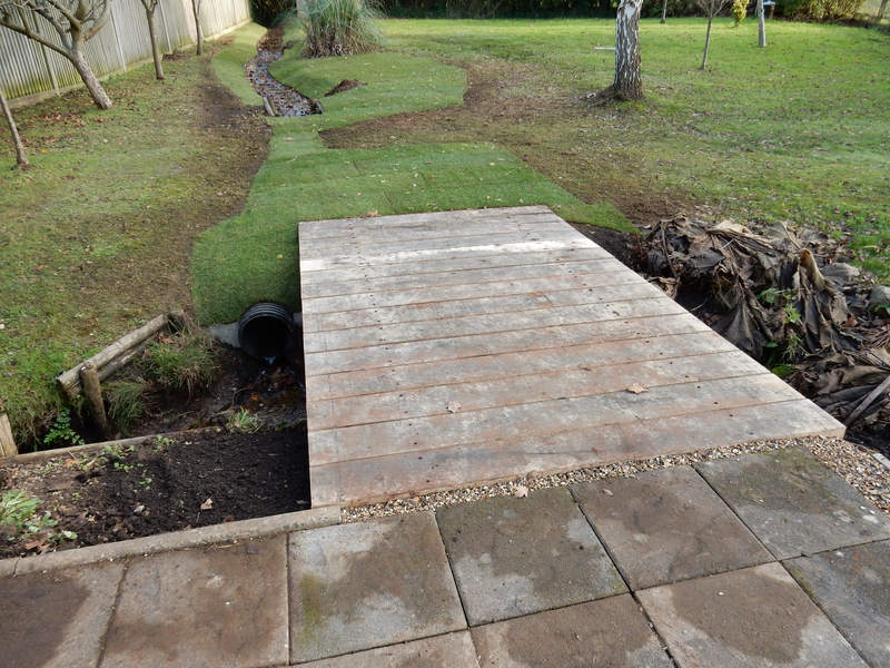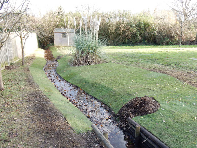Our proposal was for an extensive drainage system through out the garden lawn areas using the existing stream as an outlet point.