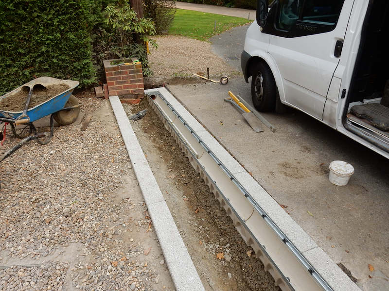 A property in Ottershaw, Surrey constantly threatened by flooding due to excessive run off of rain from the road and a large driveway. New 200mm wide surface water cast iron grated drainage channels were proposed and installed along the driveway entrance and near to the house.