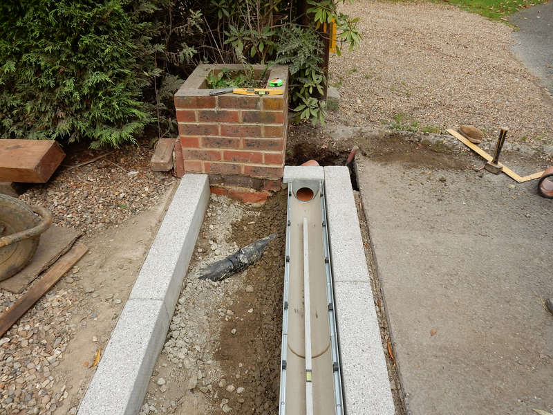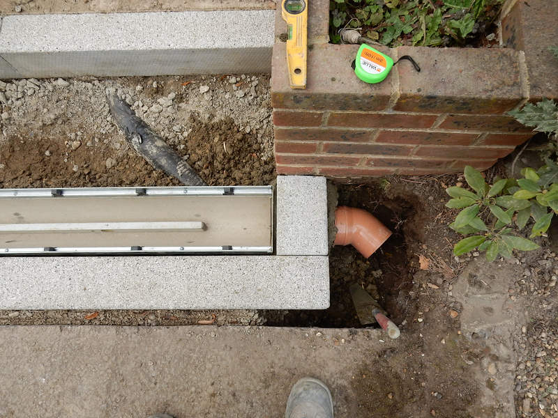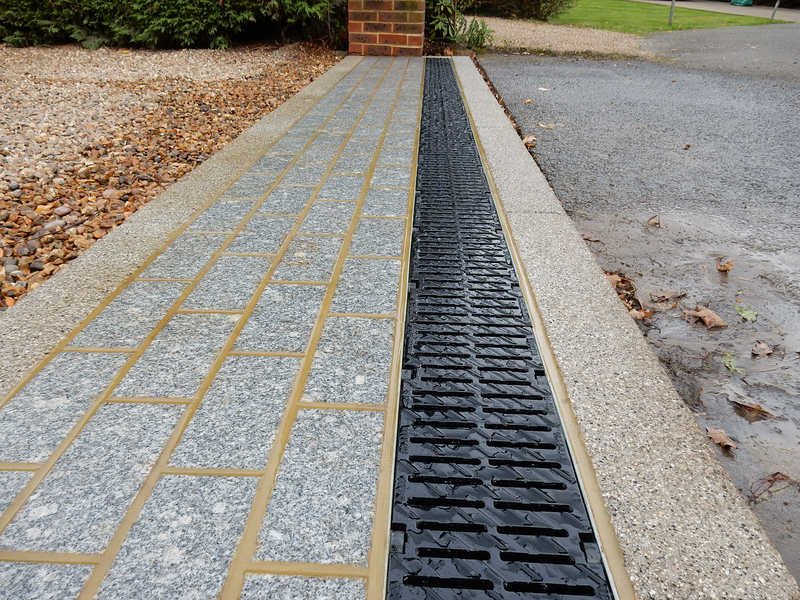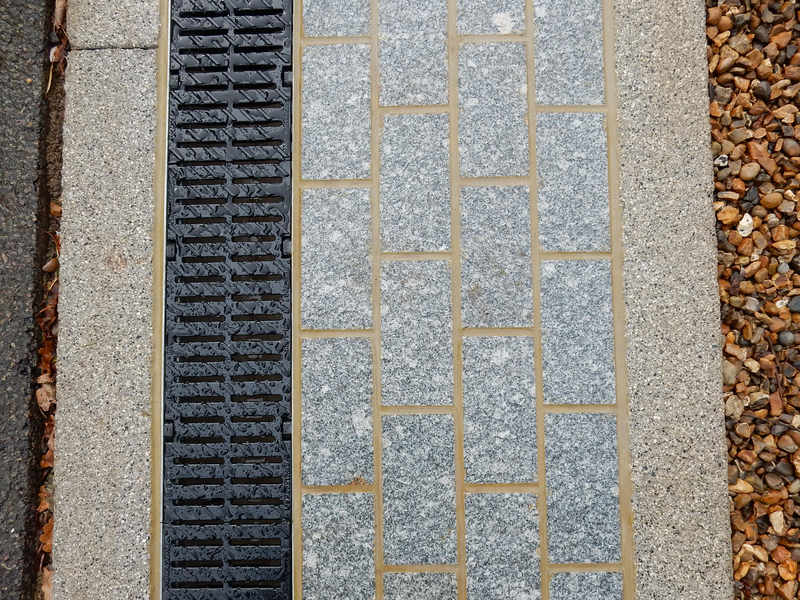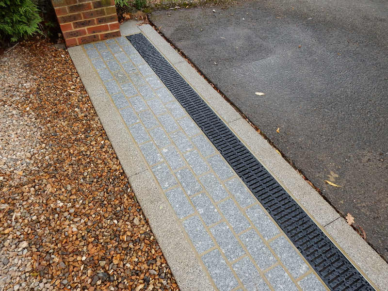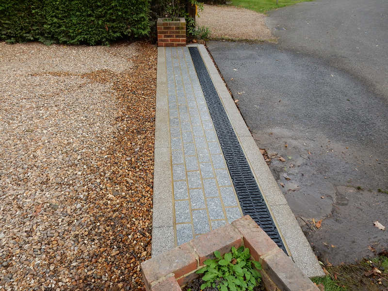 As part of both rear and front garden drainage works within this property in Esher, Surrey driveway drainage was requested to help prevent flash flooding of the front driveway areas. Strong cast iron grated drainage channels were proposed and installed along the driveway entrance within a sawn granite sett cross over edged with Marshall’s Conservation silver grey kerbing.