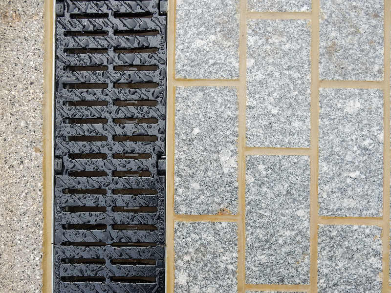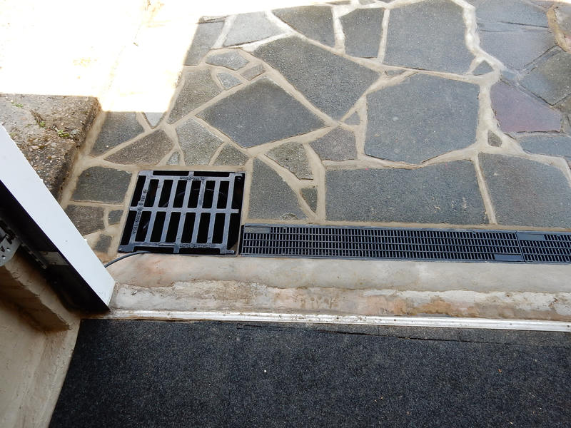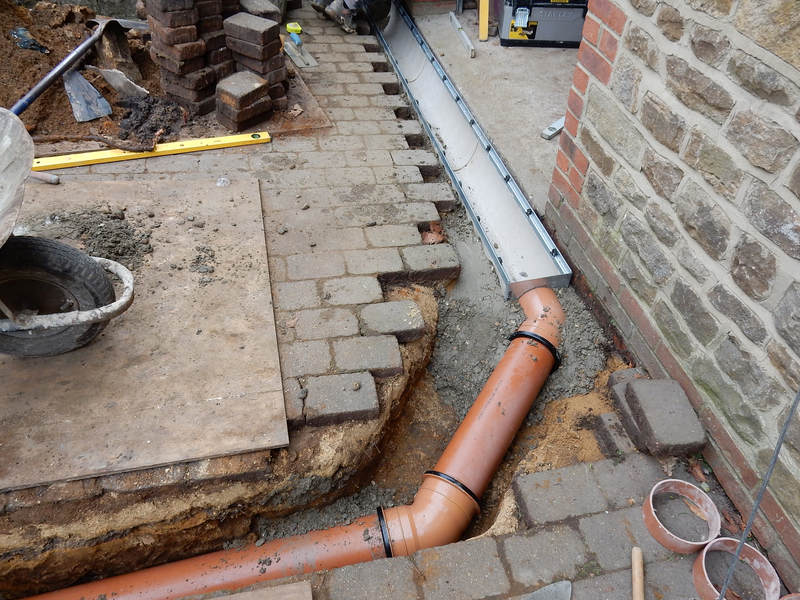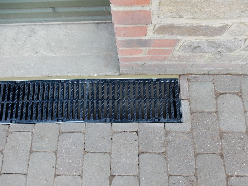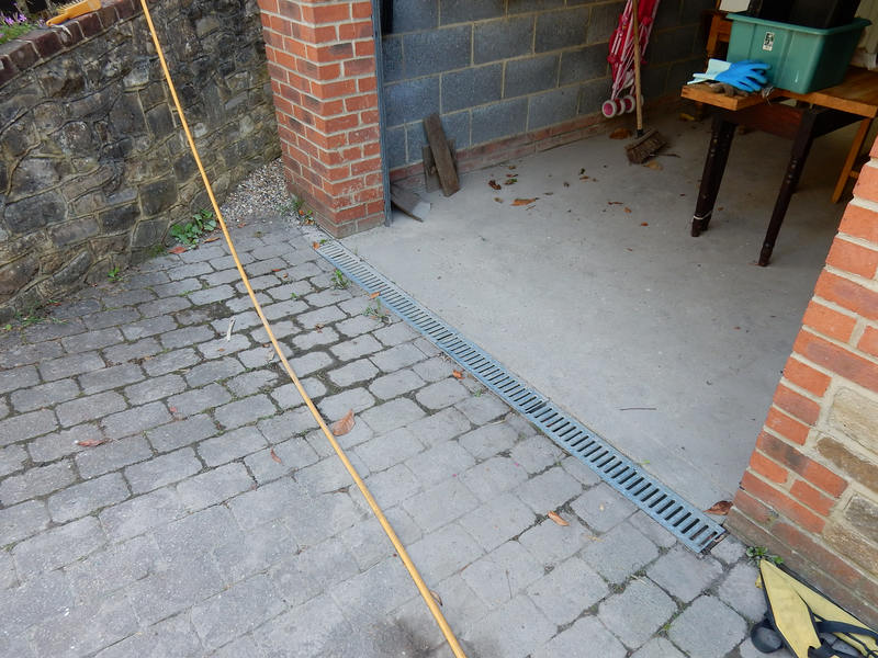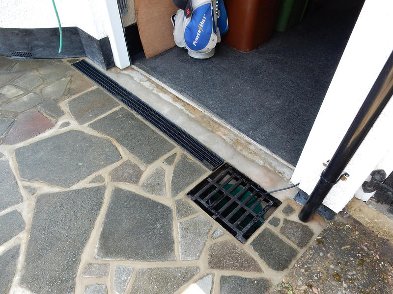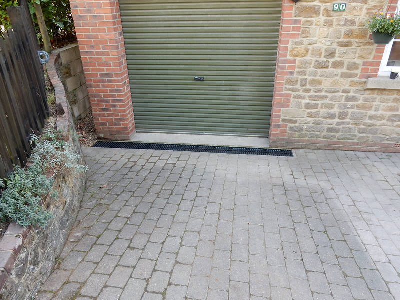 New 200mm wide surface water cast iron grated drainage channels were proposed and installed replacing the old narrow channels and connection into a near by chamber via new large diameter 160mm pipe.
