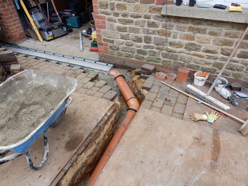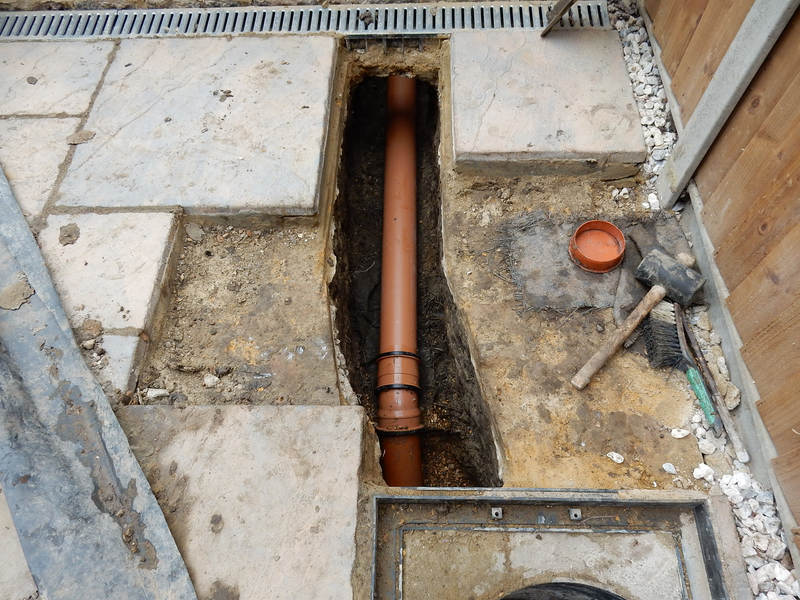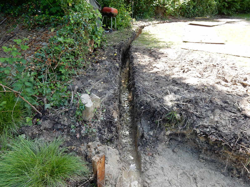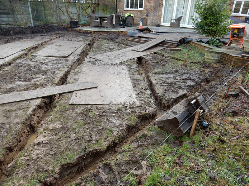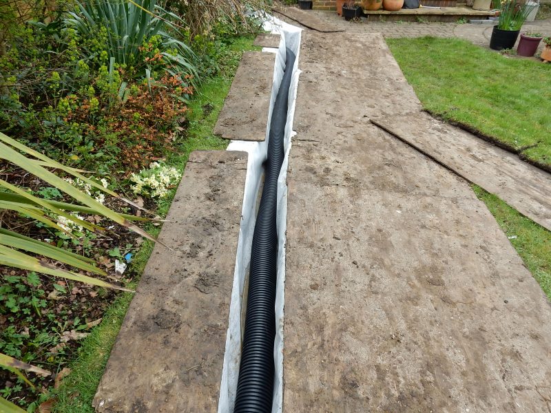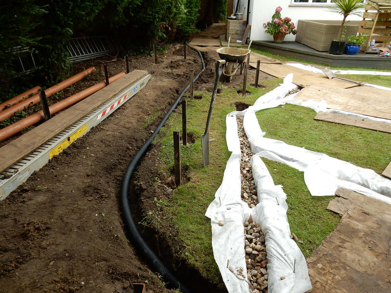 After alterations, building works and poor water management behind this clients property in Great Bookham, Leatherhead, Surrey flooding of the garden and lawn beacame an issue. A perimeter drainage scheme was proposed and installed to help catch and divert the flow through large diameter land drain pipe, passing through a silt trap and finally dispersing into a storm water drain.
