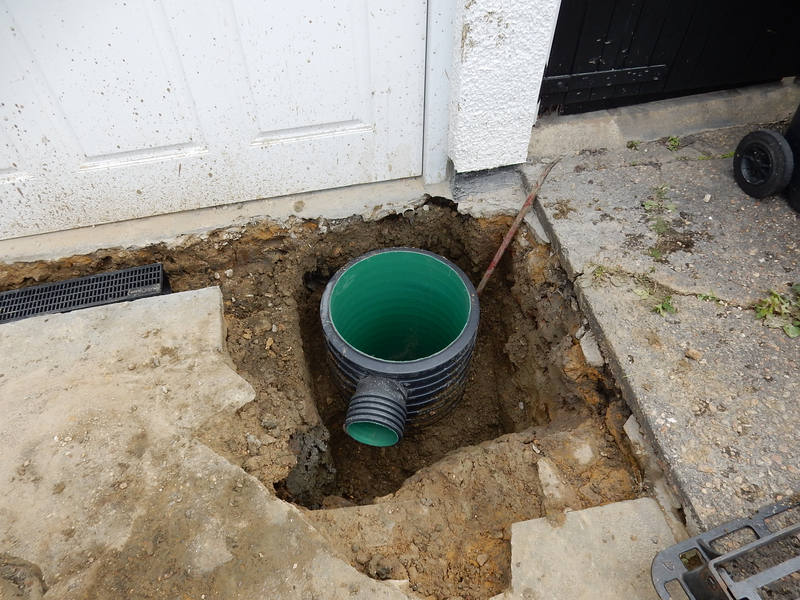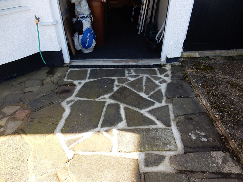 Driveway drainage issues here in Ewell, Epson, Surrey with a constantly flooded garage. A previous attempt by a builder to resolve the issue had made things worse with an installation of a soakaway directly outside of the garage.