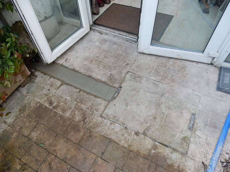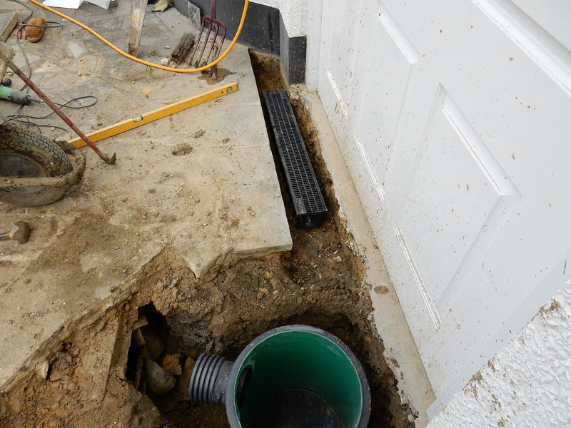 The problem here was where to disperse the water once collected. The solution proposed and installed was to install a new gully leading to a sump and pump. The collected water was then pumped up and over the garage dispersing down into a rear garden chamber. The pipe from the pump was hidden in newly installed down pipe.