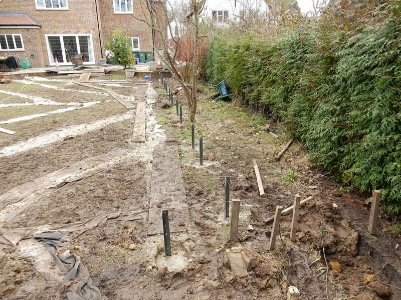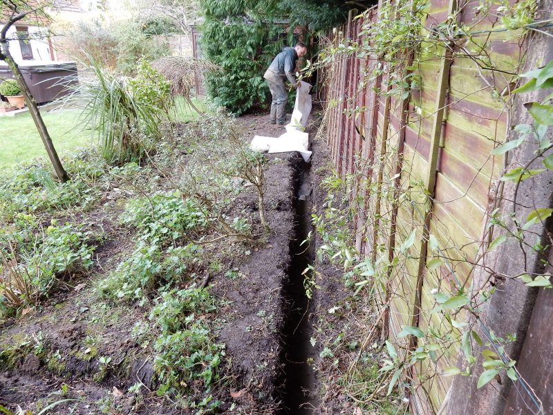 A remit here was given by the client in Cranleigh, Surrey to aid the reinstatement of a mature hedge line after it had perished whilst constantly having its roots in water. The lie of land along the hedge line captured run off from both the clients garden and mostly from the neighbouring property.