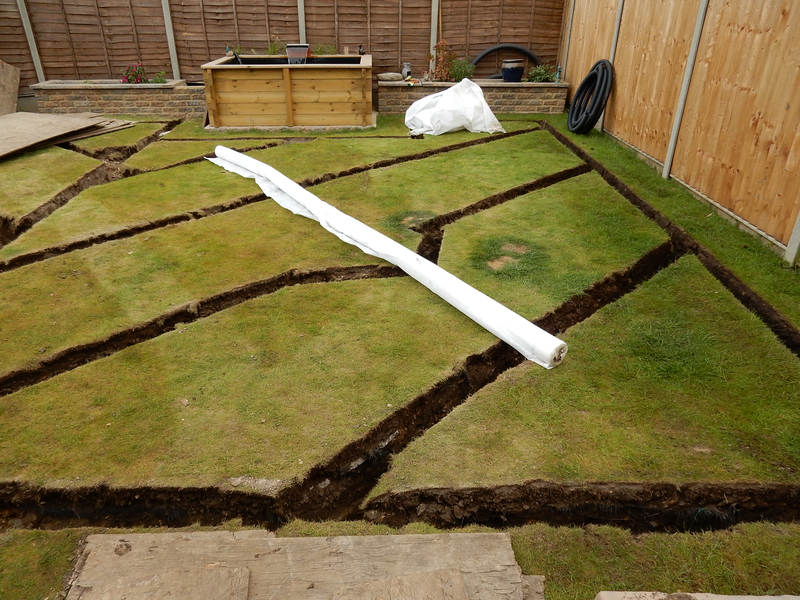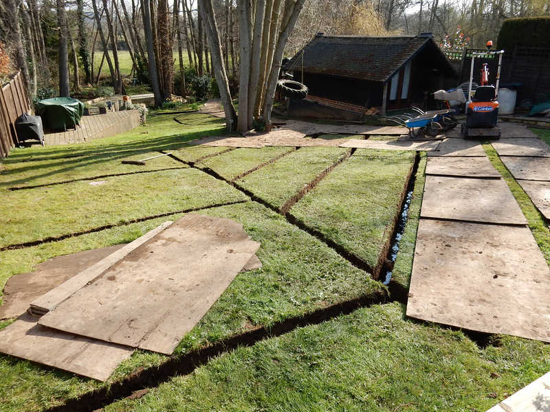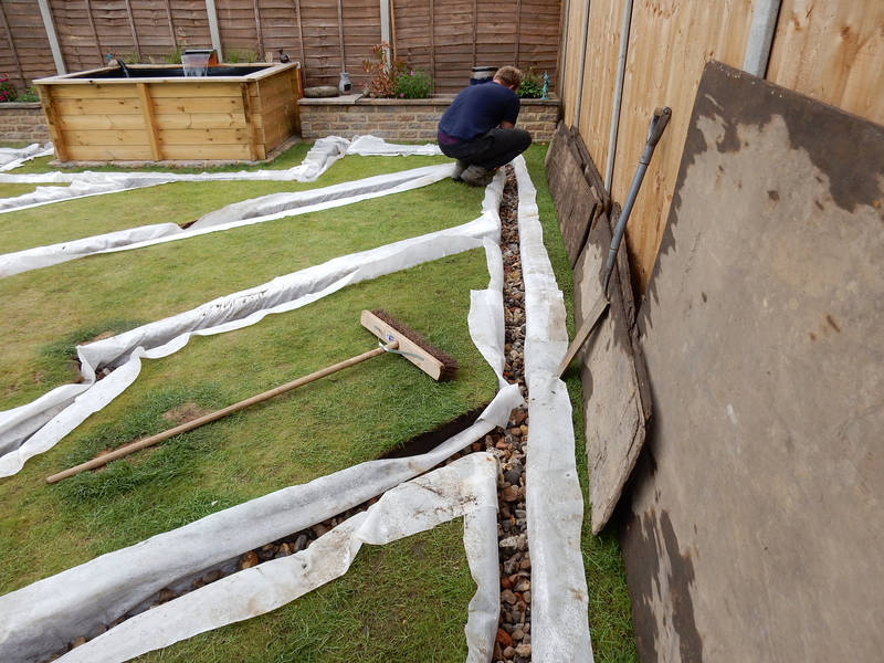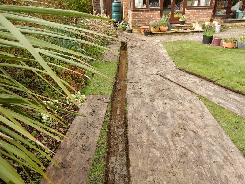 A small drainage scheme in Farnham, Surrey to help deal with a constant in ground and over ground flow from the neighbouring properties. A small area of lawn also required a drainage layer to remedy a constantly wet and boggy area of lawn.