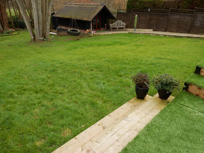 A wet and boggy lawn in East Horsley, Leatherhead, Surrey preventing the use of the garden all year round. Both drainage and a new lawn were proposed to help remidy the issue. Levels were first reduced, drainage installed capturing in ground and over ground flow from higher neighbouring properties, new hardwood sleeper edging installed and finally a new lawn laid upon a high quality rootzone medium.