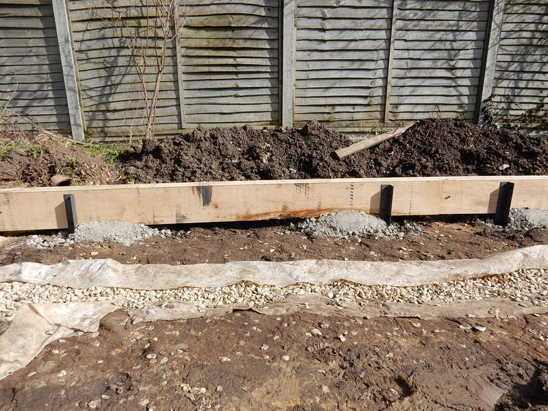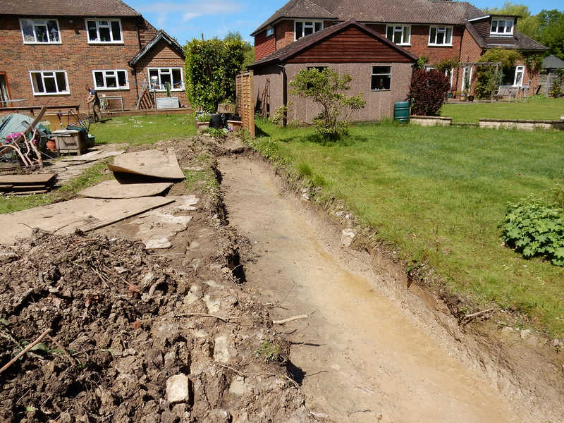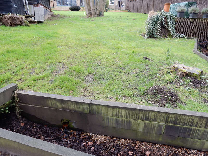Water here within this garden in Farnham, Surrey was constantly collecting behind substantial retaining walls and seeping through flooding the side pathways. The client agreed to deal with the issue house side of the retaining wall as the cost implications to install drainage behind the walling was to high.