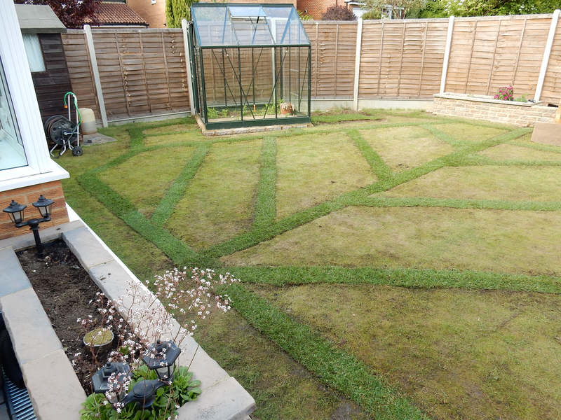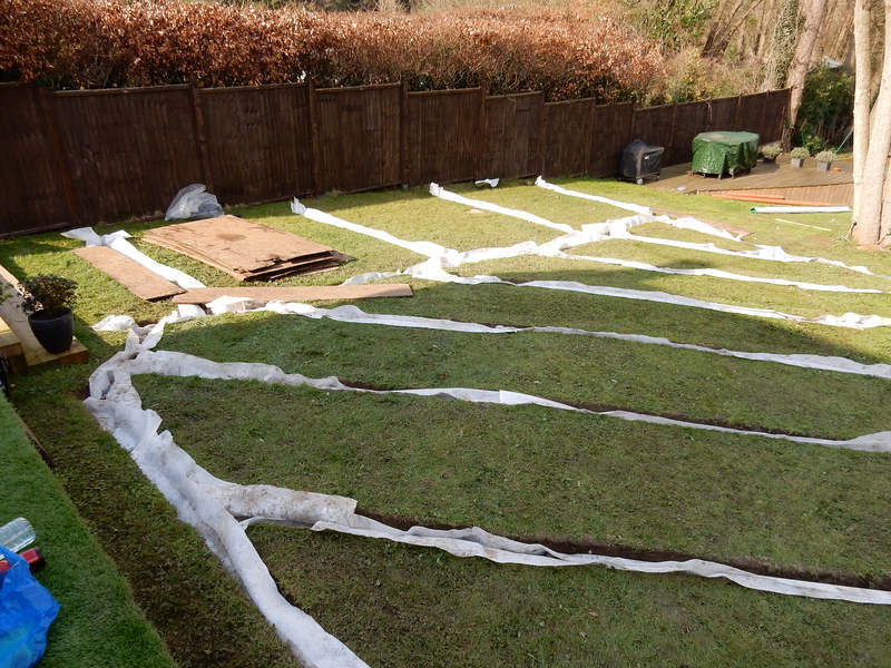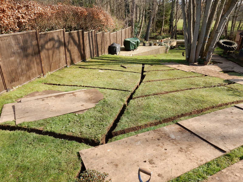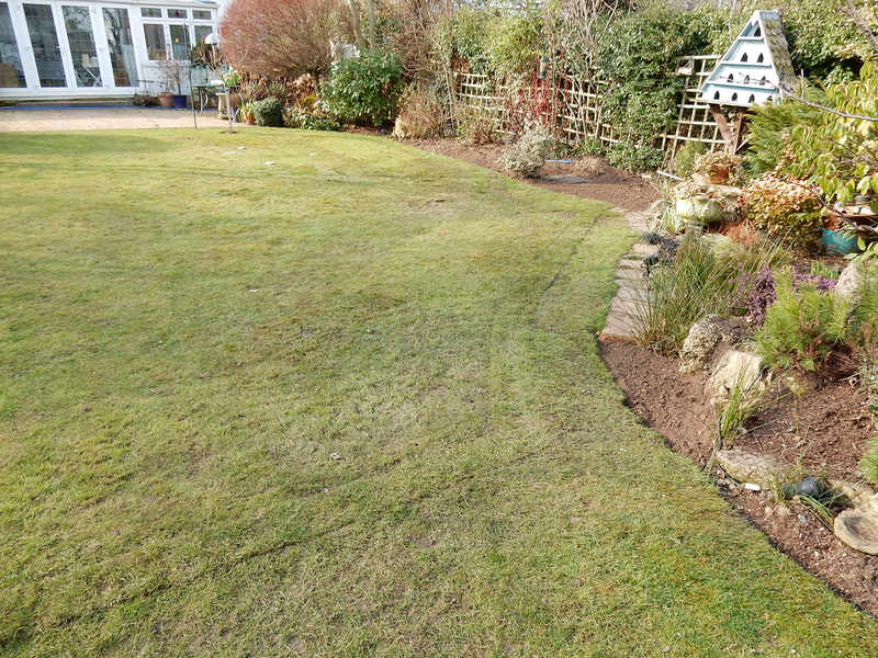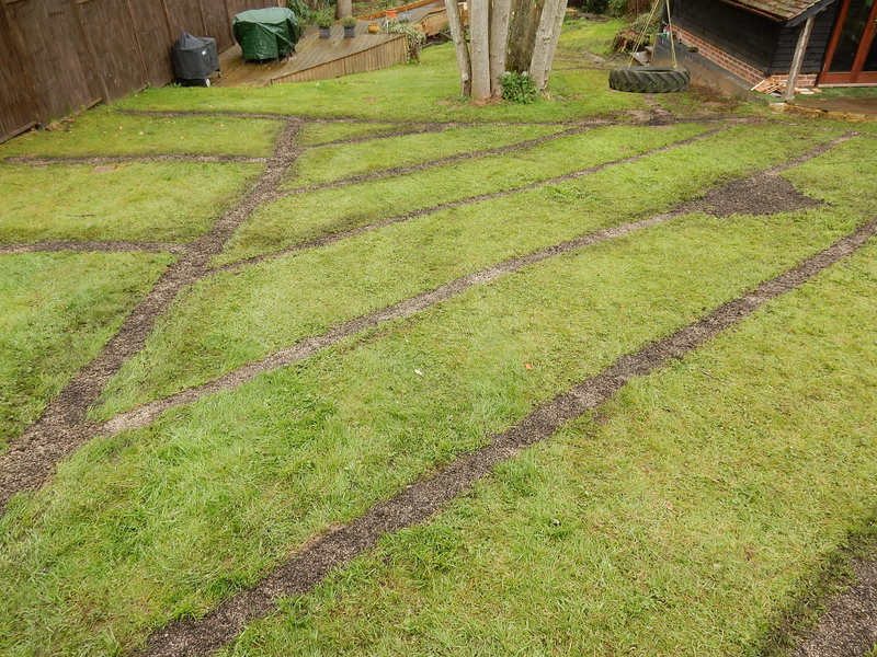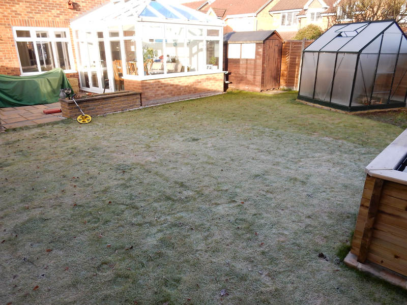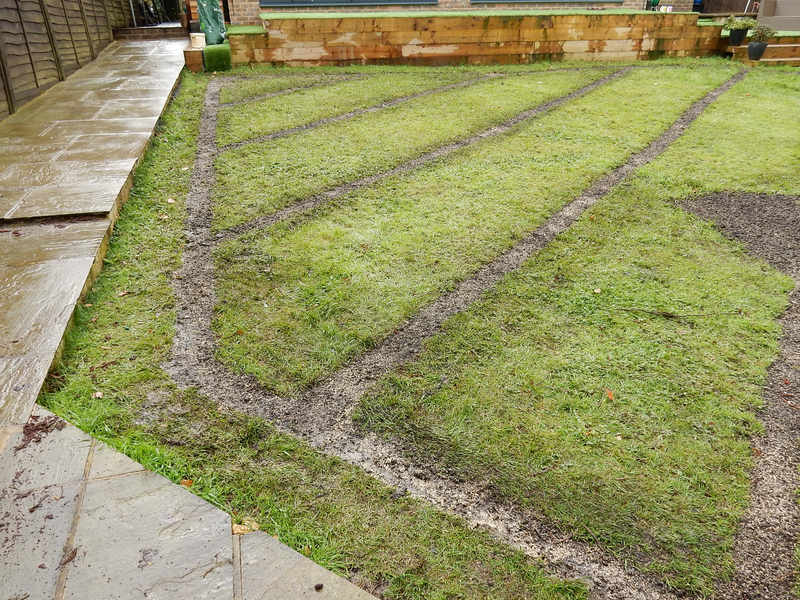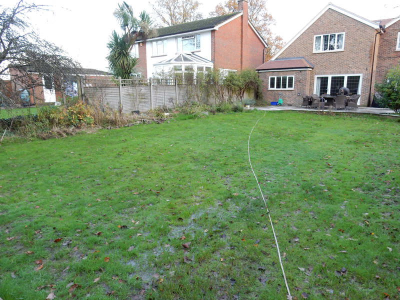 Lawn drainage in Wrecclesham, Farnham, Surrey. A poor moisture retentive soil type and constant in ground flow of water contributed to this rear lawn being wet and boggy.