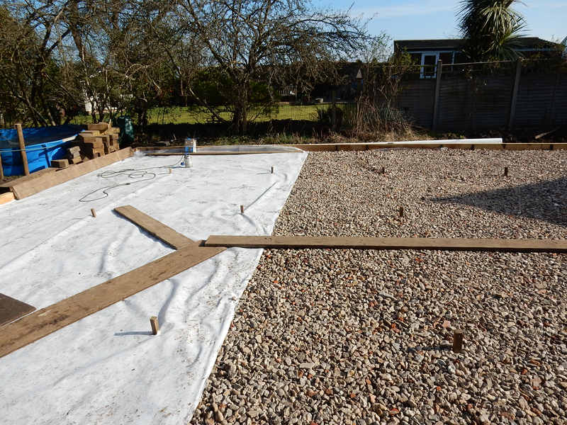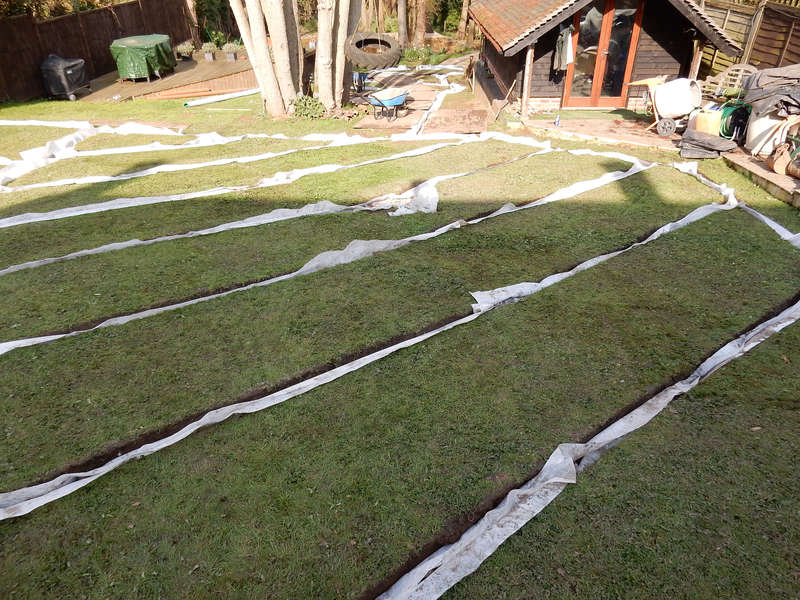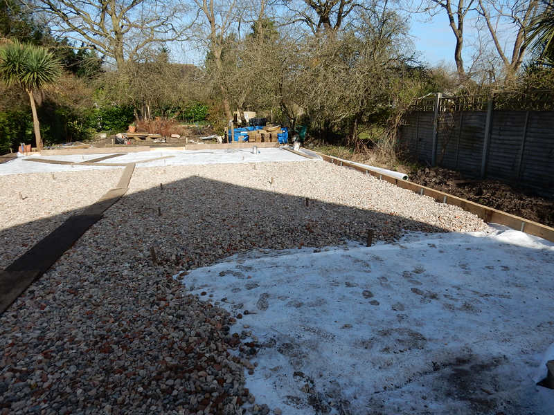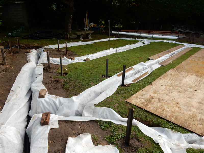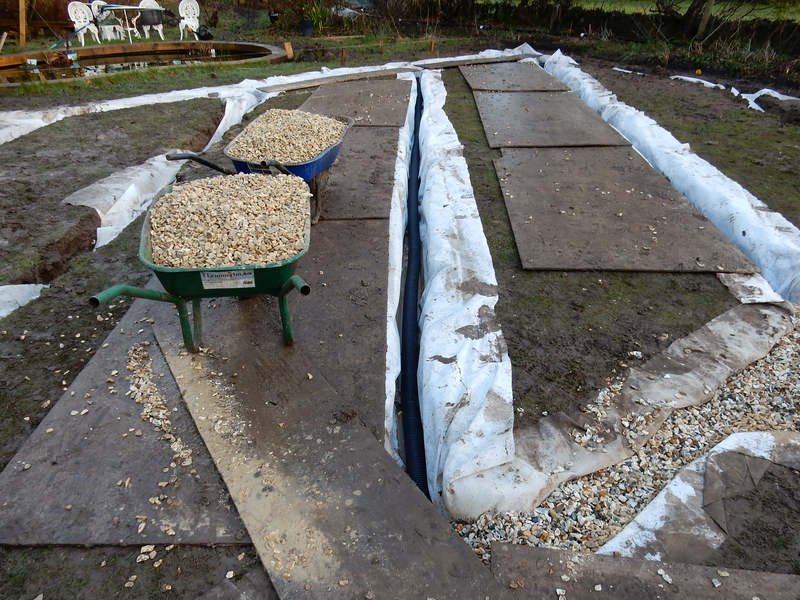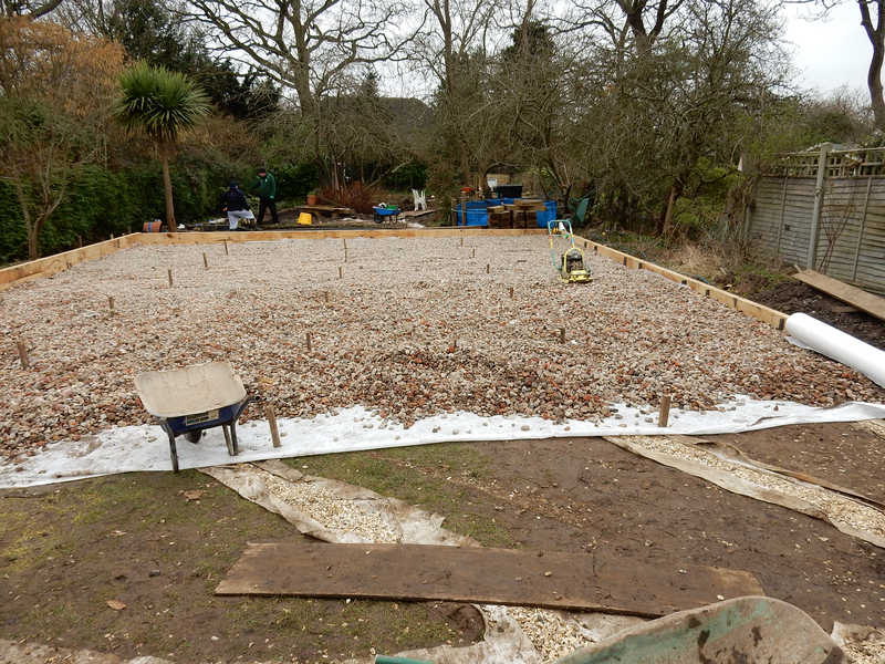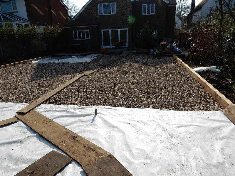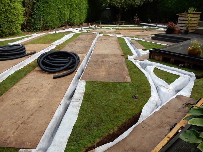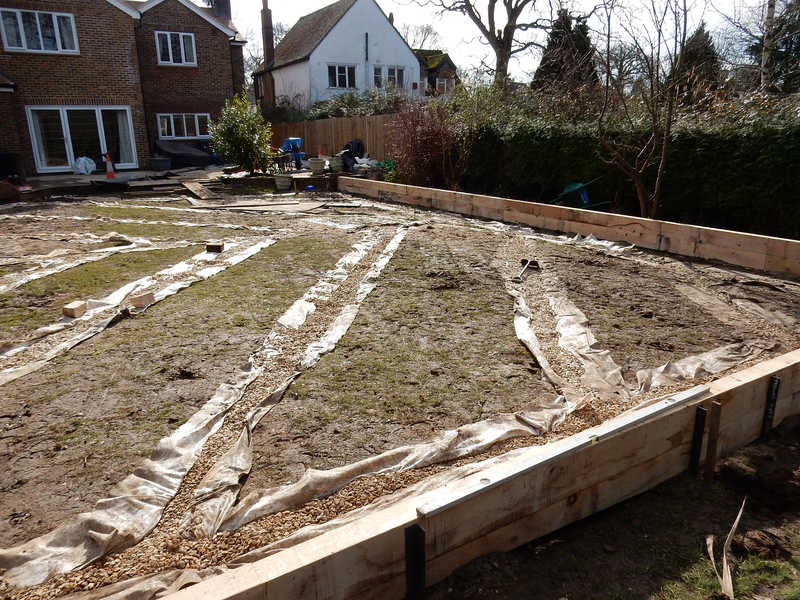 Drainage layers and lawn drainage in Chobham, Surrey. Drainage layers incorporating twinwall drainage pipe work was proposed and installed around a new oak barn build to future proof the area.