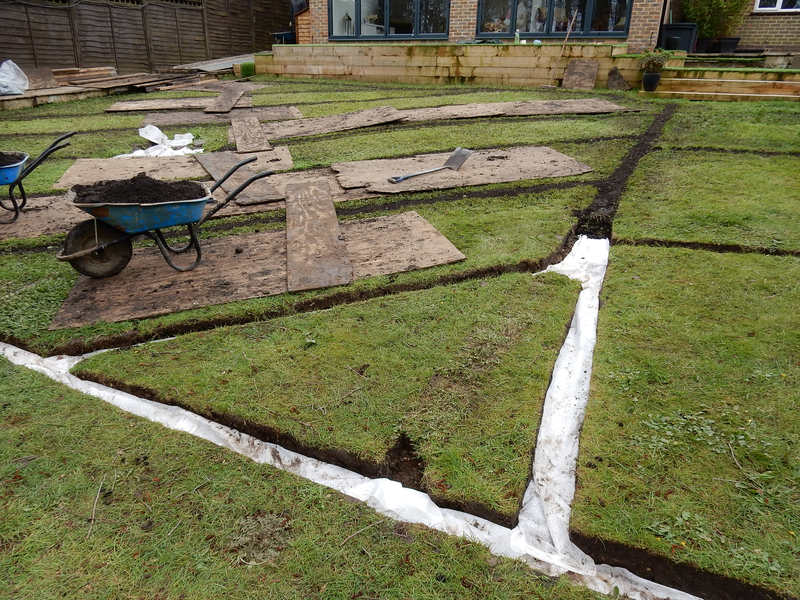 Extensive drainage was required for all lawn areas for this garden in Wrecclesham, Surrey. With a predominant heavy sticky clay soil type, during wet conditions these lawn areas in both rear and front gardens remained waterlogged and unusable.