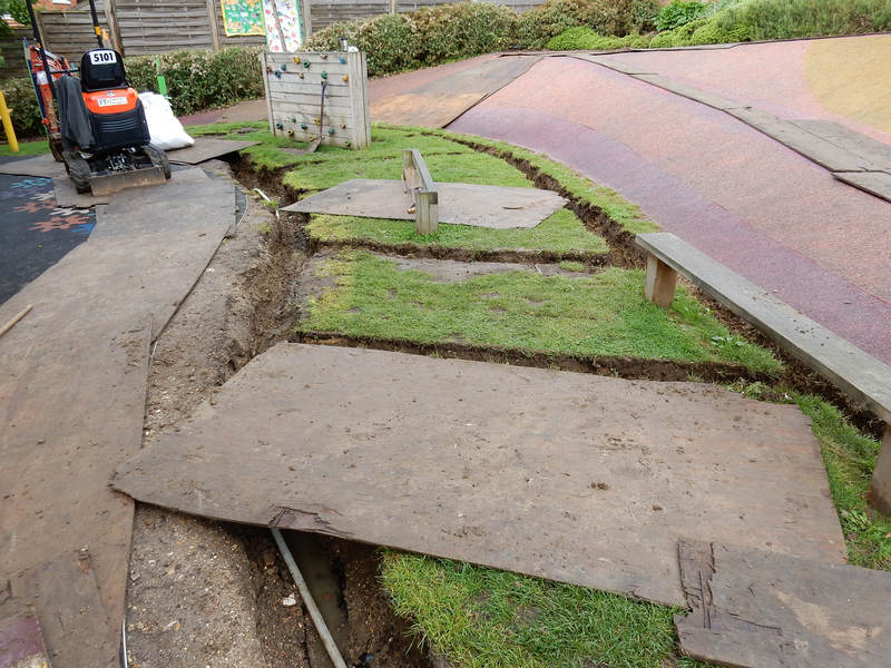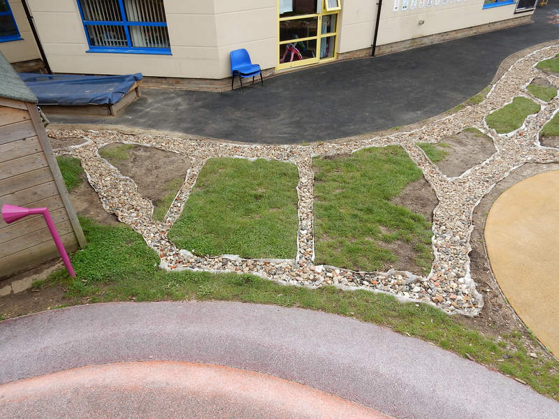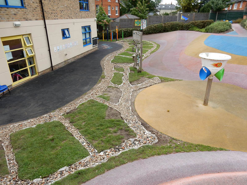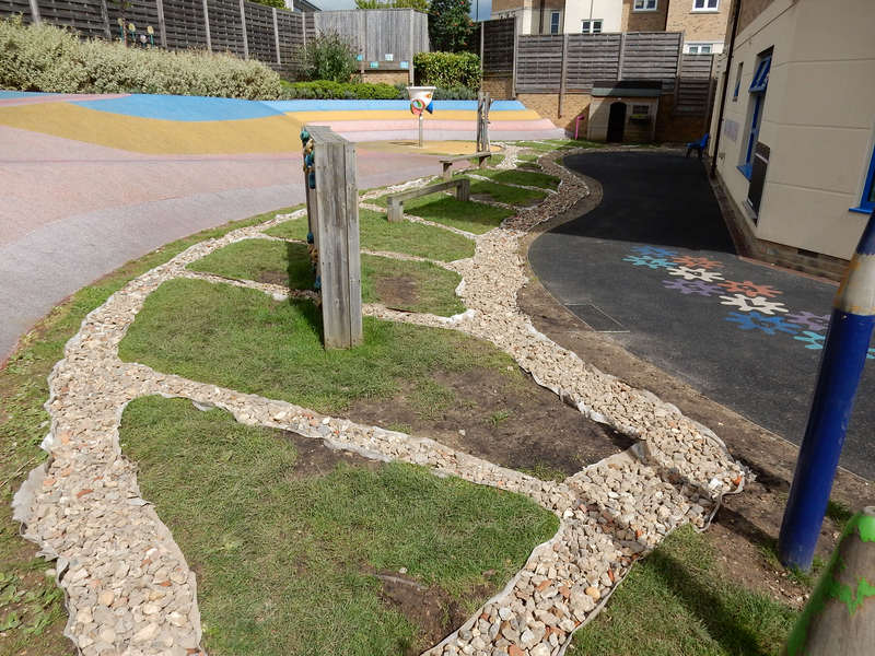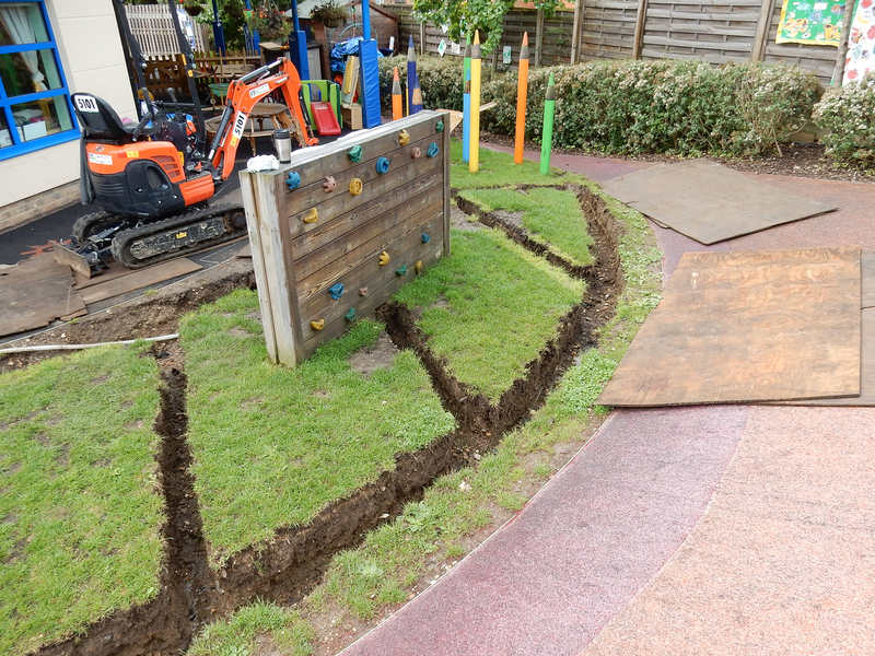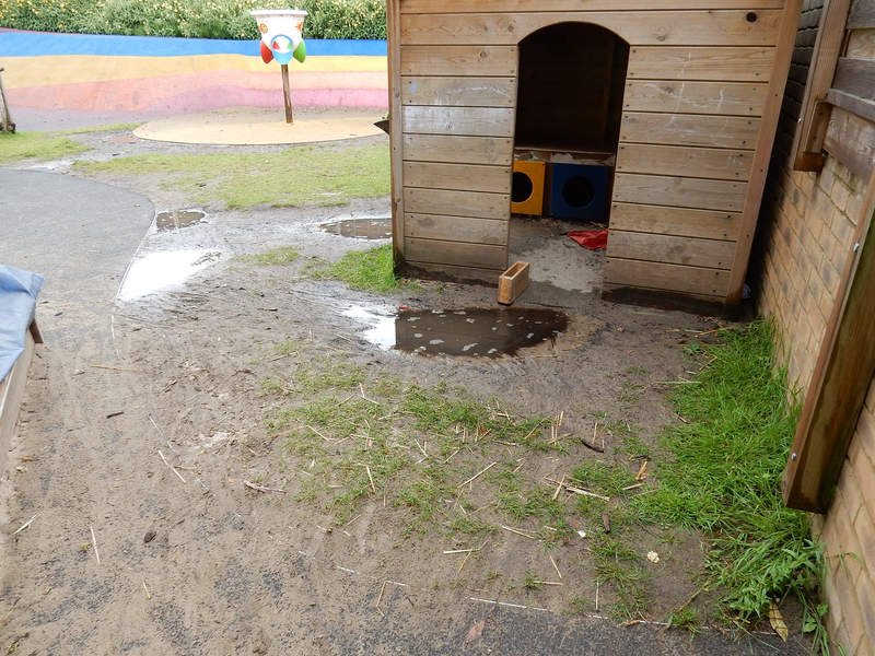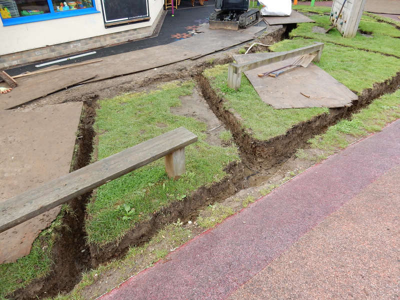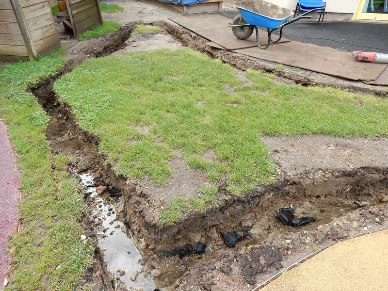 A day nursery in Farnham, Surrey struggling with water logged play areas due to its low lying level and surrounding higher hard surfaces. Drainage was installed leading to an existing storm water drain.