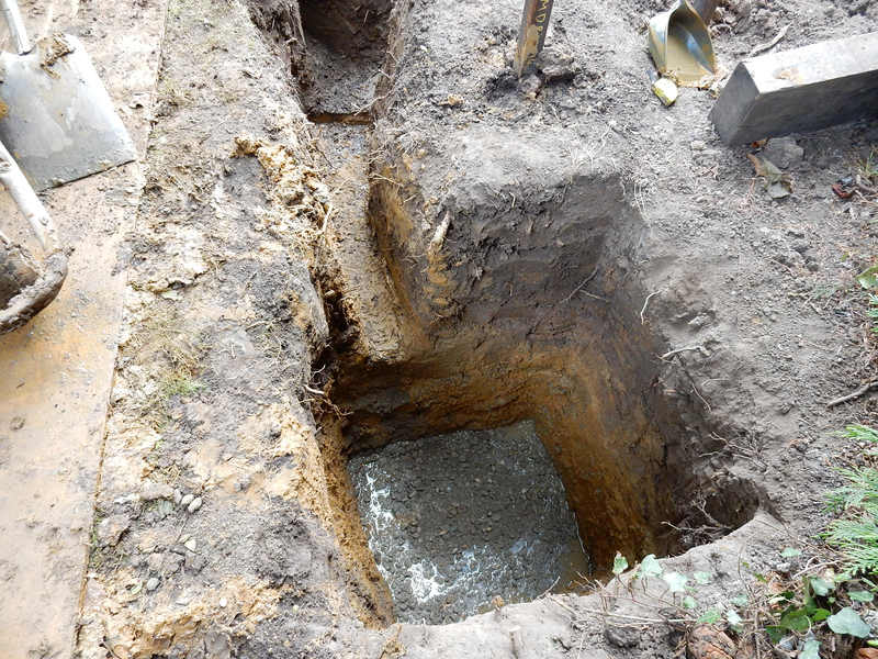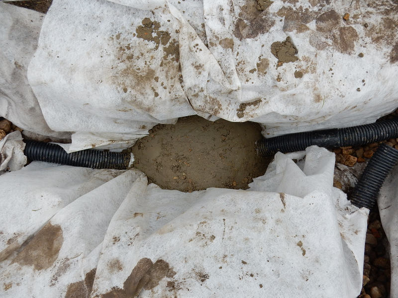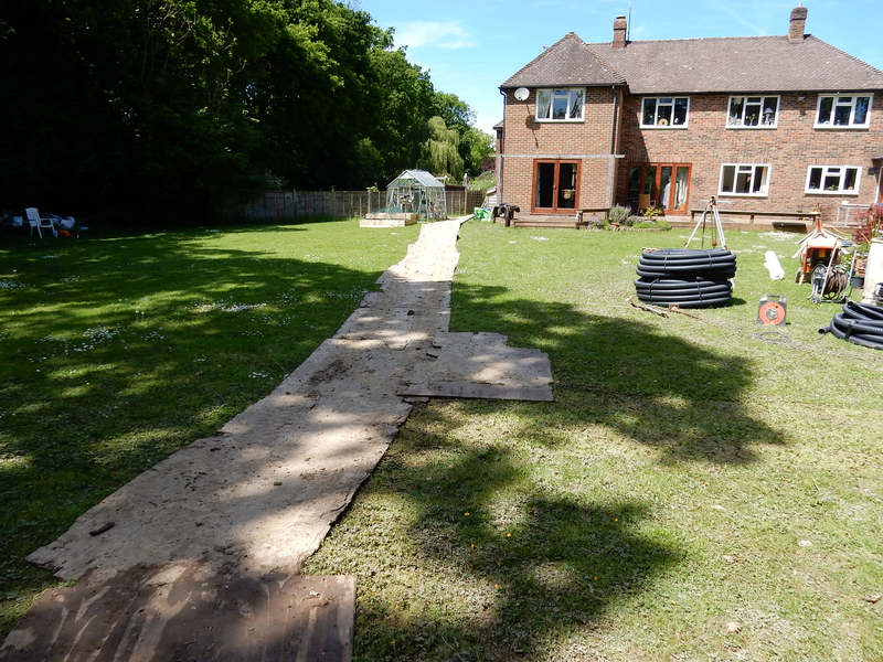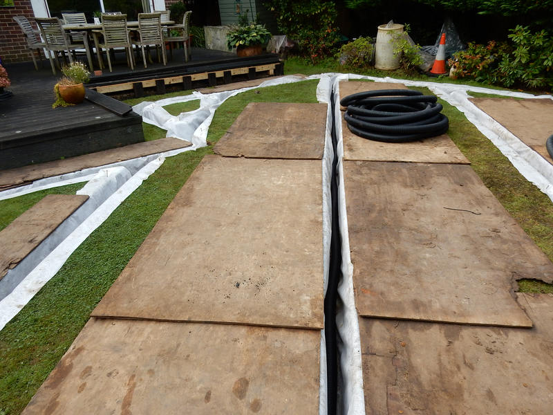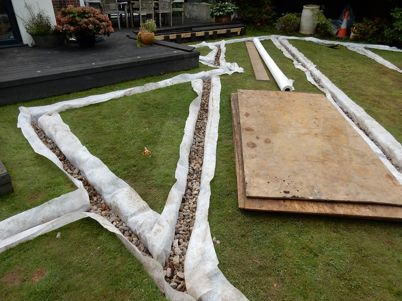 Grey water management in Winchfield, Hampshire. The clients remit here was to enable the dispersal of excess grey water within their property. The solution proposed involved the controlled discharge of grey water through a drainage layer.