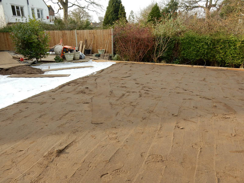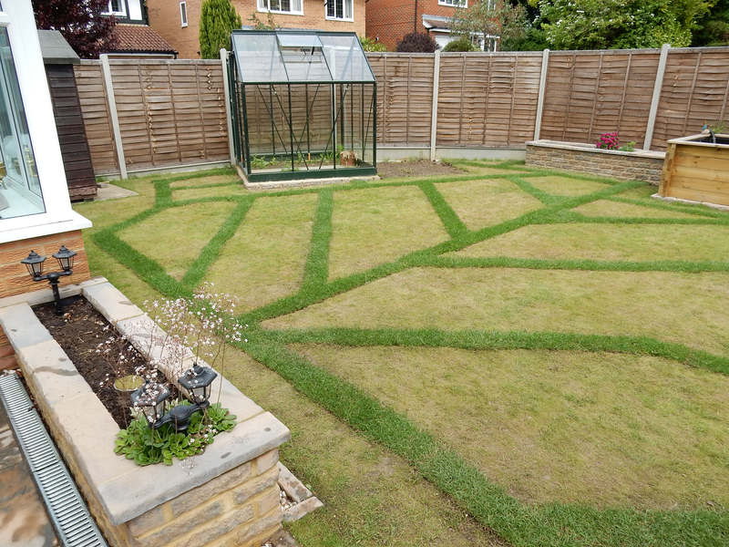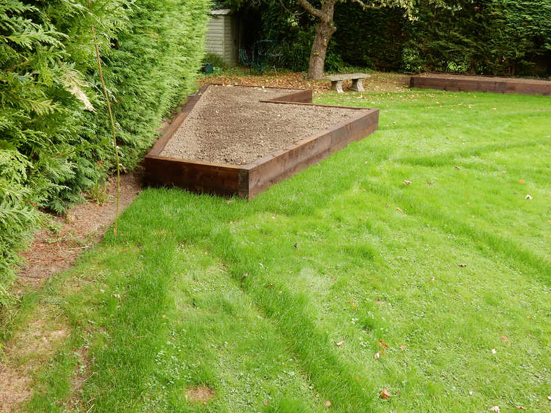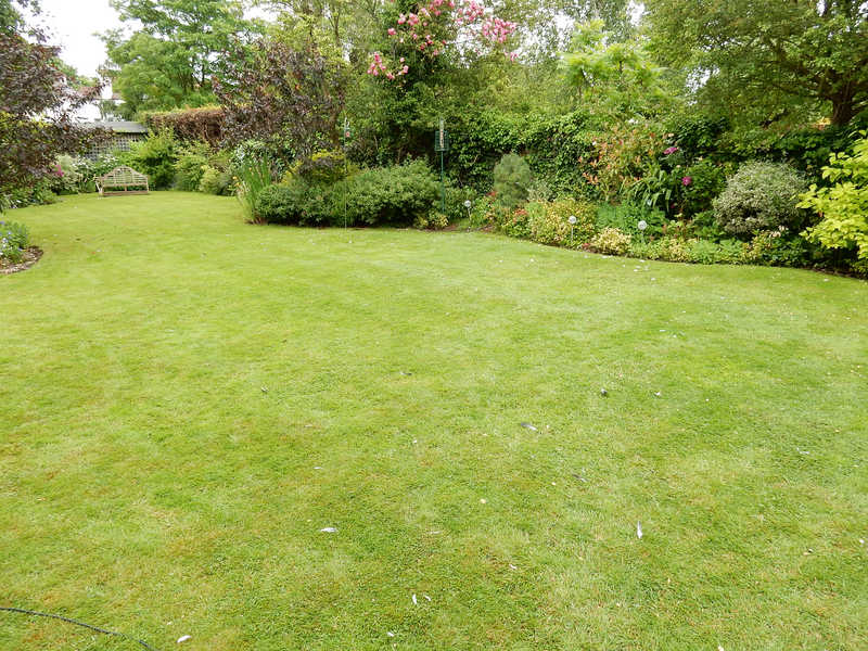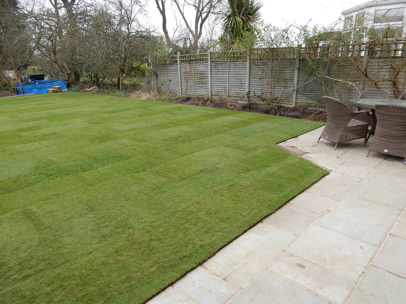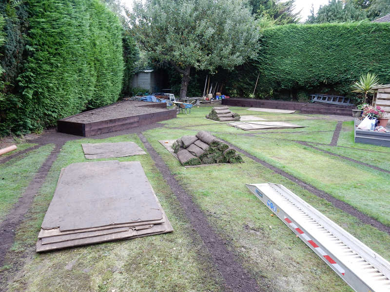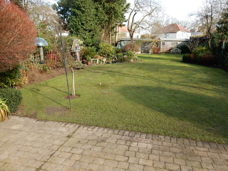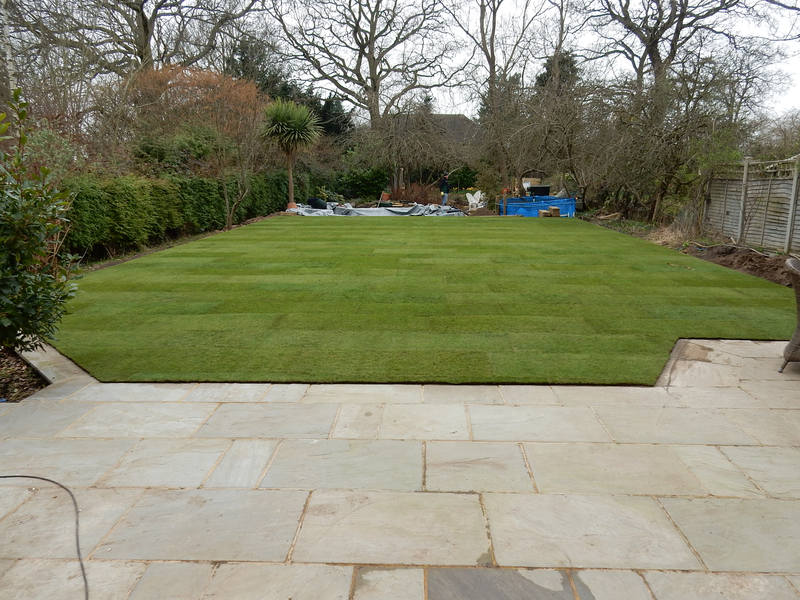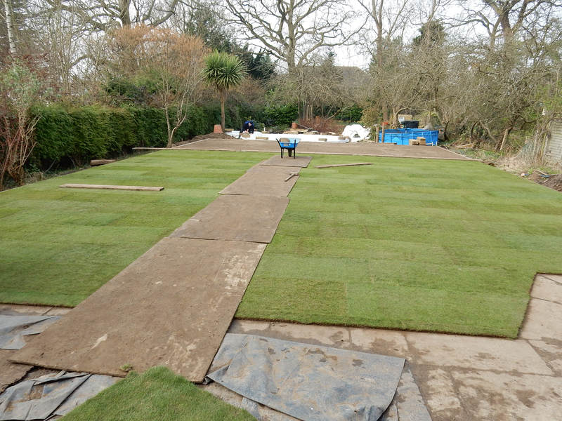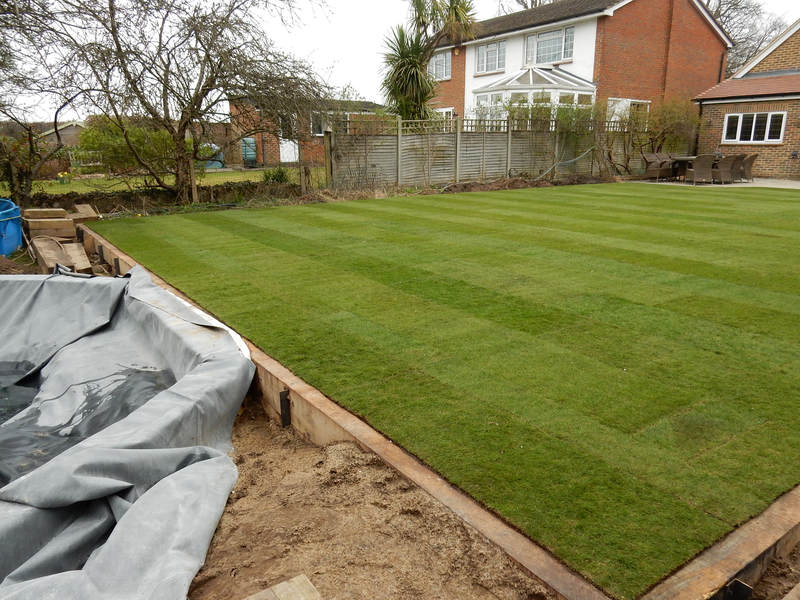 After extensive redevelopment of this property in Hersham, Surrey the building works had compromised an area of the garden lawn. Poor soil was striped from the area drainage installed, new soil medium imported back over the site and areas re-seeded.