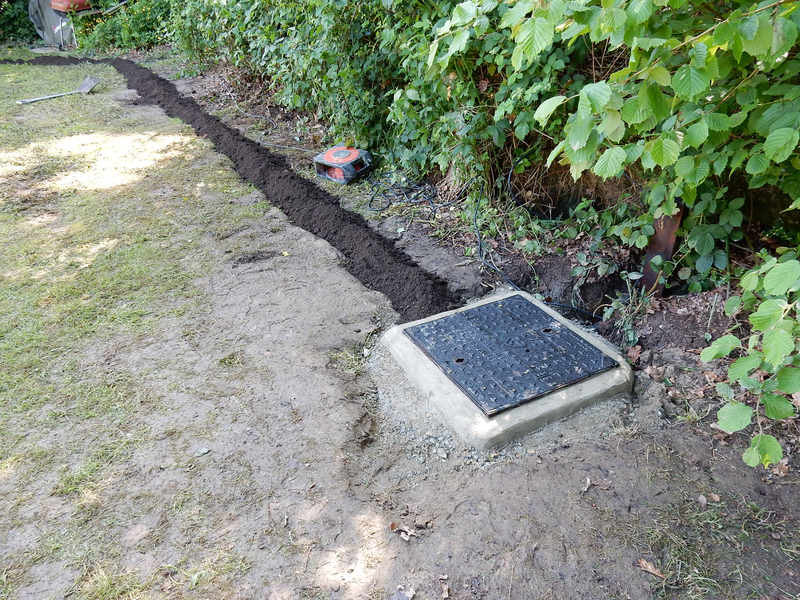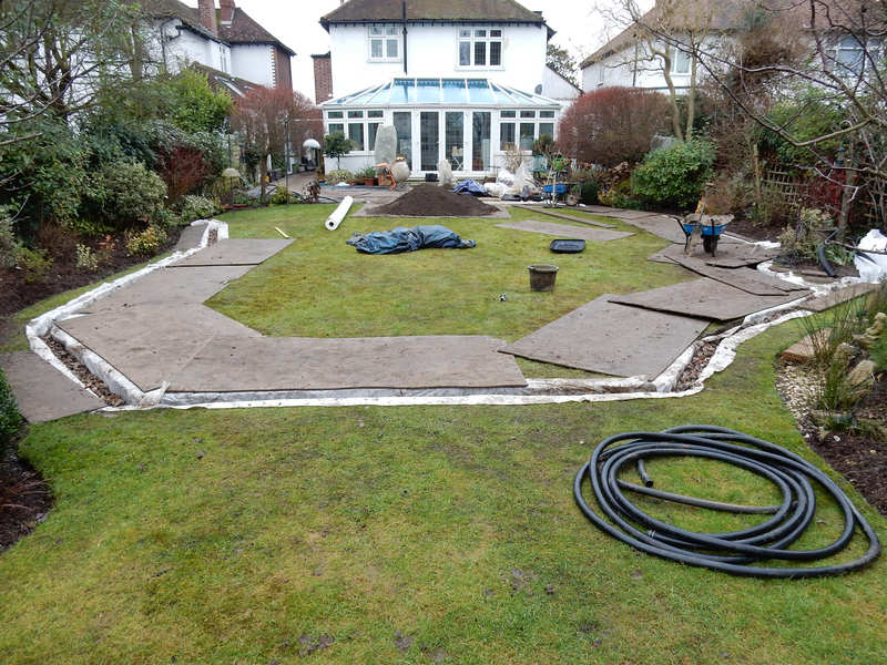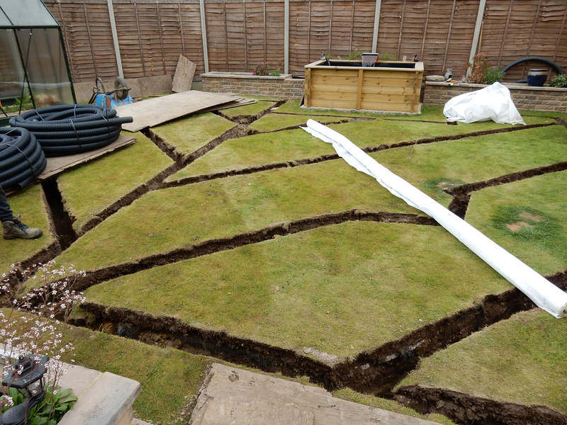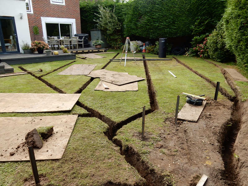 A substantial garden drainage project in Esher, Surrey. With poor clay soil this lawn had always struggled with poor drainage. The proposed scheme was installed leading to a sump and pump as the only viable outlet point was an underground piped culvert cutting through the garden.