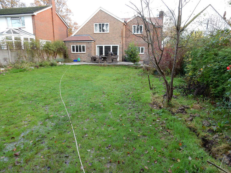 A rear lawn in Esher, surrey struggling with water logging problems due to the clay soil. A drainage scheme was proposed and implemented using a sump and pump to move the drained water from the rear garden to the road side storm water drains. Drainage runs were finally re-turfed.