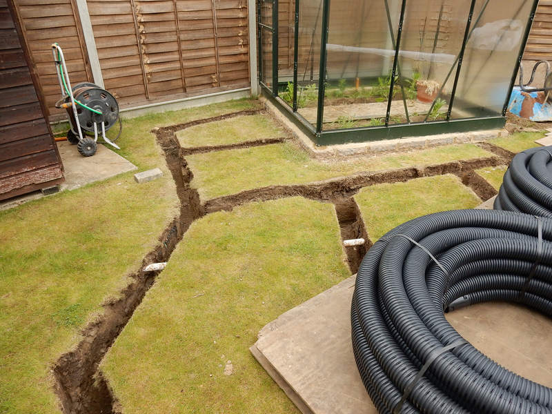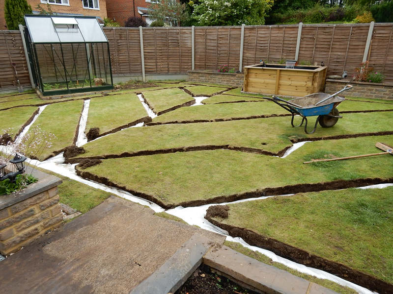 Drainage issues within this rear garden in Wokingham, Berkshire created unusable flooded planting areas, a flooded glass house and a very wet lawn. After discussion it was agreed to incorporate all areas of the garden within a single drainage solution with almost instant effect on completion.