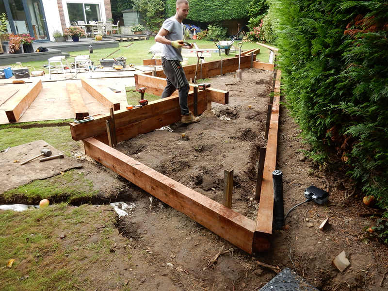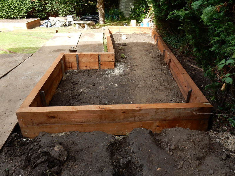 Timber sleepers were used for terracing and the raised planter. Old English Chippings were used for walkways and seating areas.