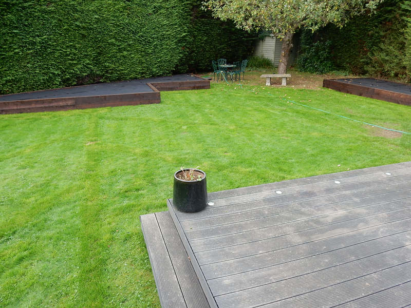 The clients remit here in Guildford, Surrey was to provide a high quality lawn. To assist this major drainage works were implemented incorporating both drainage runs and a drainage layer via the use of a sump and pump. The new lawn was raised with a surround of new oak sleepers with the new lawn laid upon a high quality rootzone soil medium.