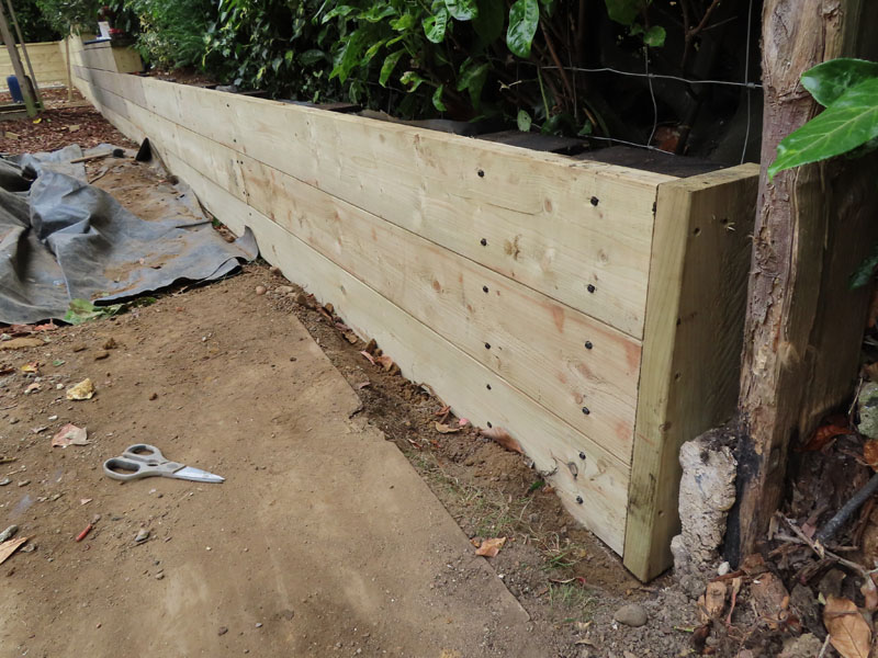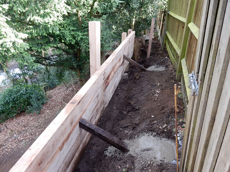 Sections were removed to allow for new walling. Treated sleepers used for support posts had an additional protection of creosote applied, new fascia timbers secured to support posts, rear of wall protected with a geodrain membrane prior to backfill and wall capped off with the same fascia timber. A clear wood protector applied.