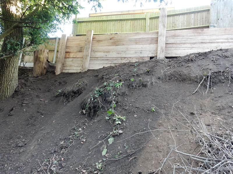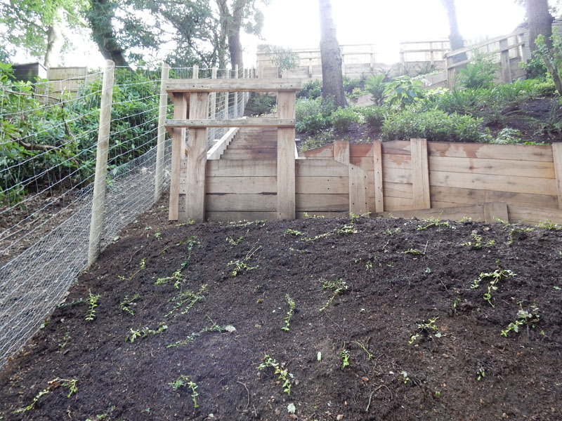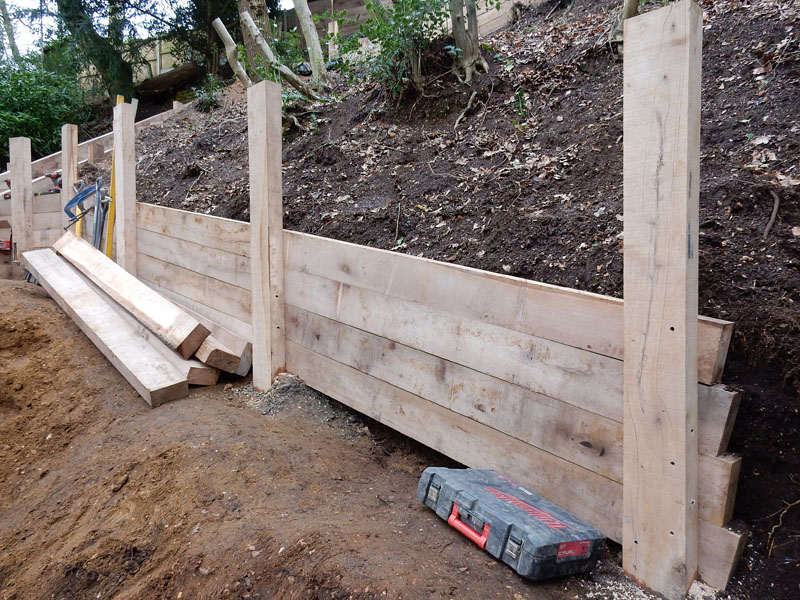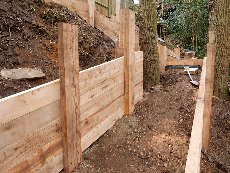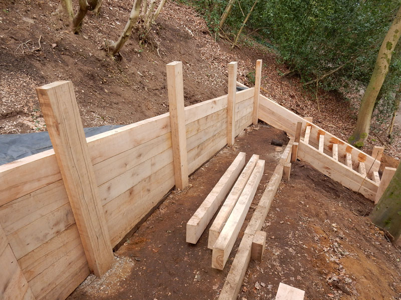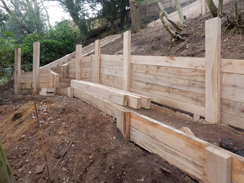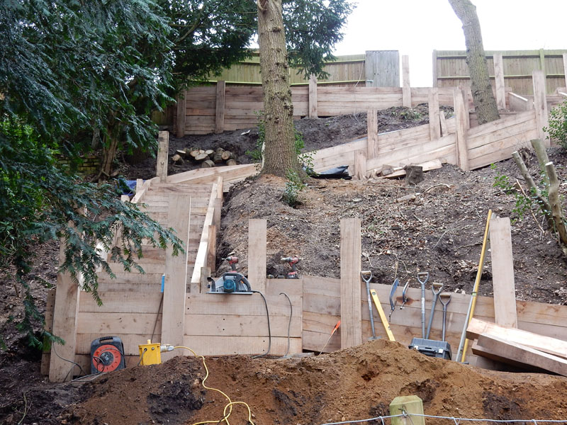 New oak sleeper retaining walls in Farnham, Surrey, GU9. Our remit here was to provide safe access from the rear garden down to a public footpath.
