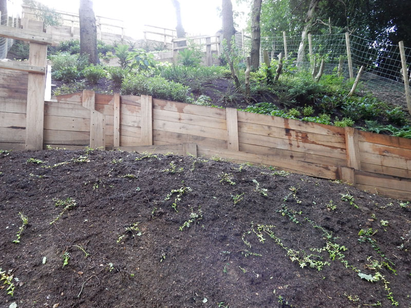 Oak sleeper retaining walls were located and installed to enable the inclusion of sleeper steps. Rear of walling where possible had a protected application of creosote prior to the inclusion of a heavy duty polythene to help prevent contact with soil backfill. This has been by far one of the most physically challenging projects undertaken.