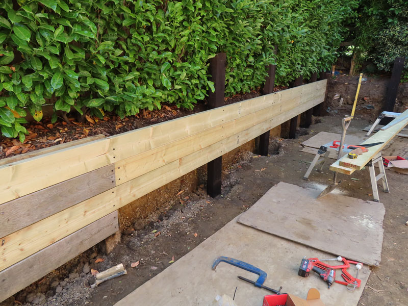 A sleeper retaining wall was requested here by this client in East Horsley, Leatherhead, Surrey to replace an old rotting sleeper wall. New treated brown hardwood sleepers were used.