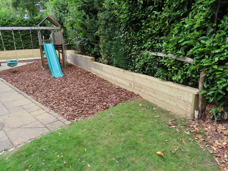 Replacement of sections of old timber retaining walling in Claygate, Surrey, KT10. Contact with soil from the rear of timber retaining wall had caused decay and rotting. Other works included a concrete base and play bark replacement.